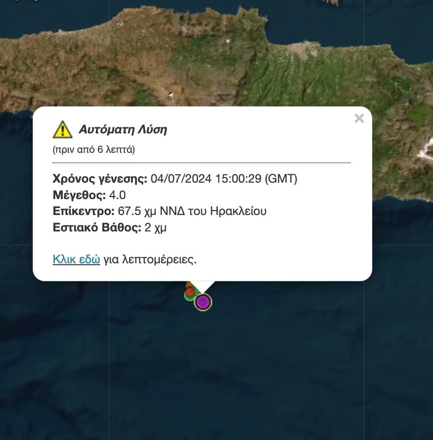 Nα σημειώσουμε ότι τα τελευταία 24ωρα στην Κρήτη και στην συγκεκριμένη περιοχή έχουν καταγραφεί πολλοί σεισμοί της έντασης 4 έως 4,8 ρίχτερ.