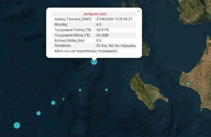 Σεισμική δόνηση σημειώθηκε το στις 16:25 το απόγευμα του Σαββάτου νοτιοδυτικά του Ληξουρίου.