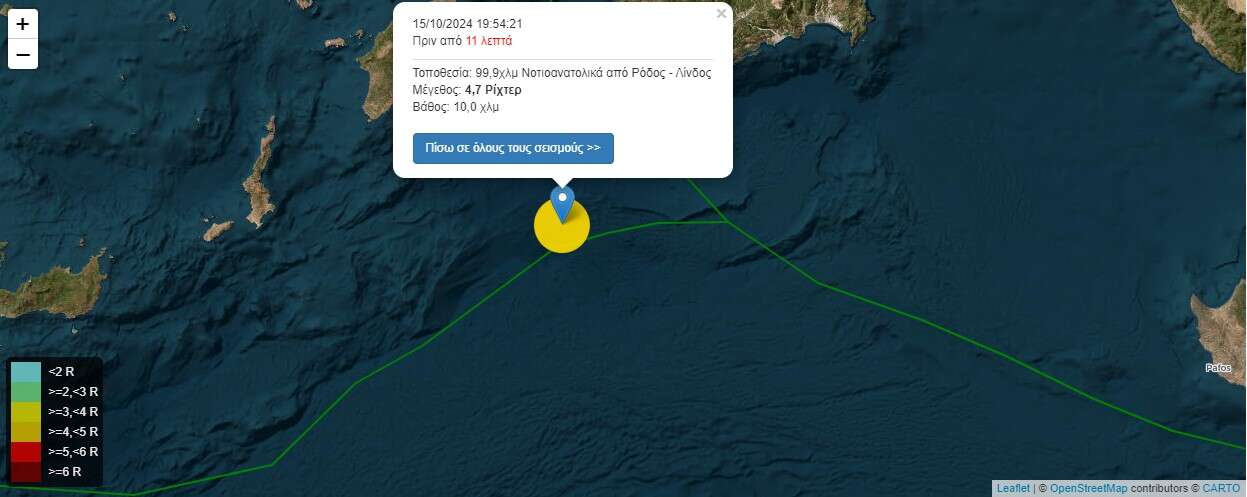 Σεισμός 4,7 Ρίχτερ 99,9χλμ Νοτιοανατολικά από Ρόδος – Λίνδος στις 15/10/2024 19:54:21