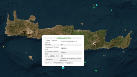 Νέος σεισμός 4,6 Ρίχτερ σημειώθηκε στις 22.34 στην Κρήτη.
