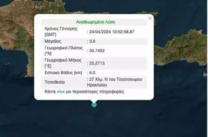 Σεισμός 3,6 ρίχτερ έγινε στην Κρήτη με το επίκεντρο να βρίσκεται νότια του Ηρακλείου.