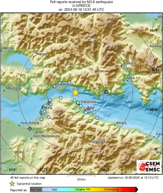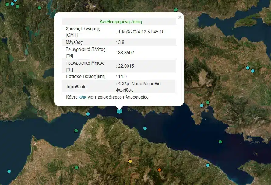 Ο σεισμός, σύμφωνα με το Γεωδυναμικό Ινστιτούτο, έγινε στις 15.51 μετά το μεσημέρι, με επίκεντρο 4 χιλιόμετρα από το Μαραθιά Φωκίδας.