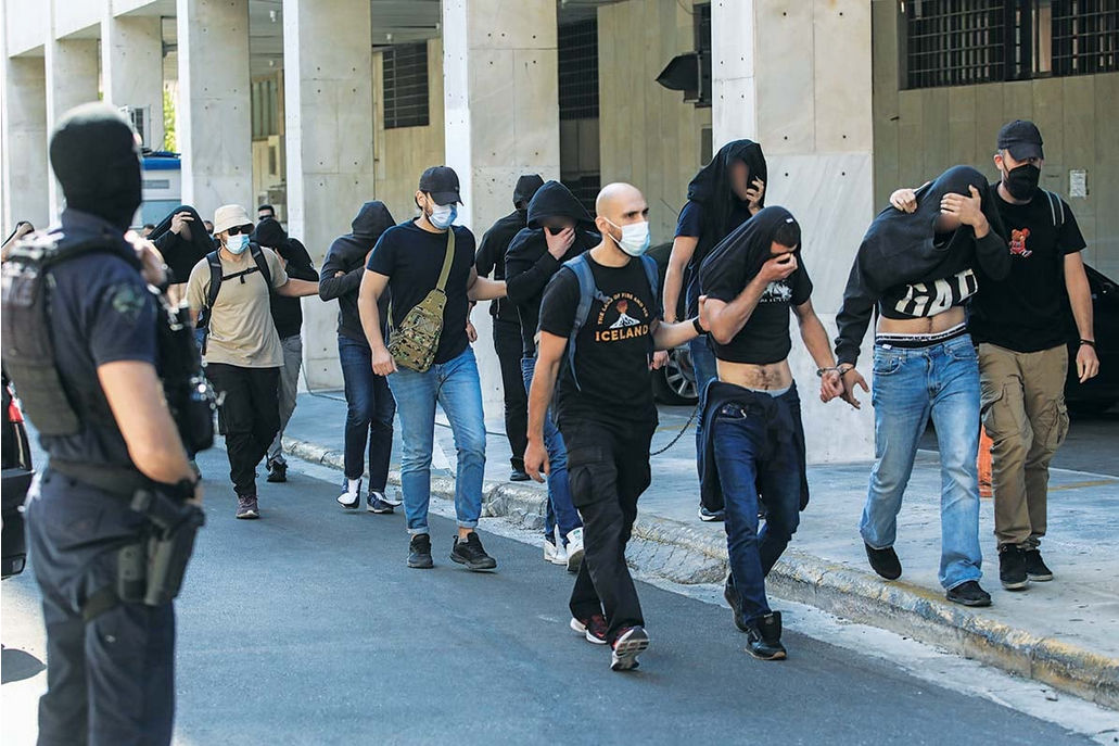 Οι συλληφθέντες για το μακελειό στη Νέα Φιλαδέλφεια οδηγήθηκαν χθες στα δικαστήρια της πρώην Σχολής Ευελπίδων. Όλοι ήταν σε επιφυλακή. Συνολικά οι συλληφθέντες ήταν 104 και οι περισσότεροι ήταν Κροάτες οπαδοί της Ντιναμό Ζάγκρεμπ.