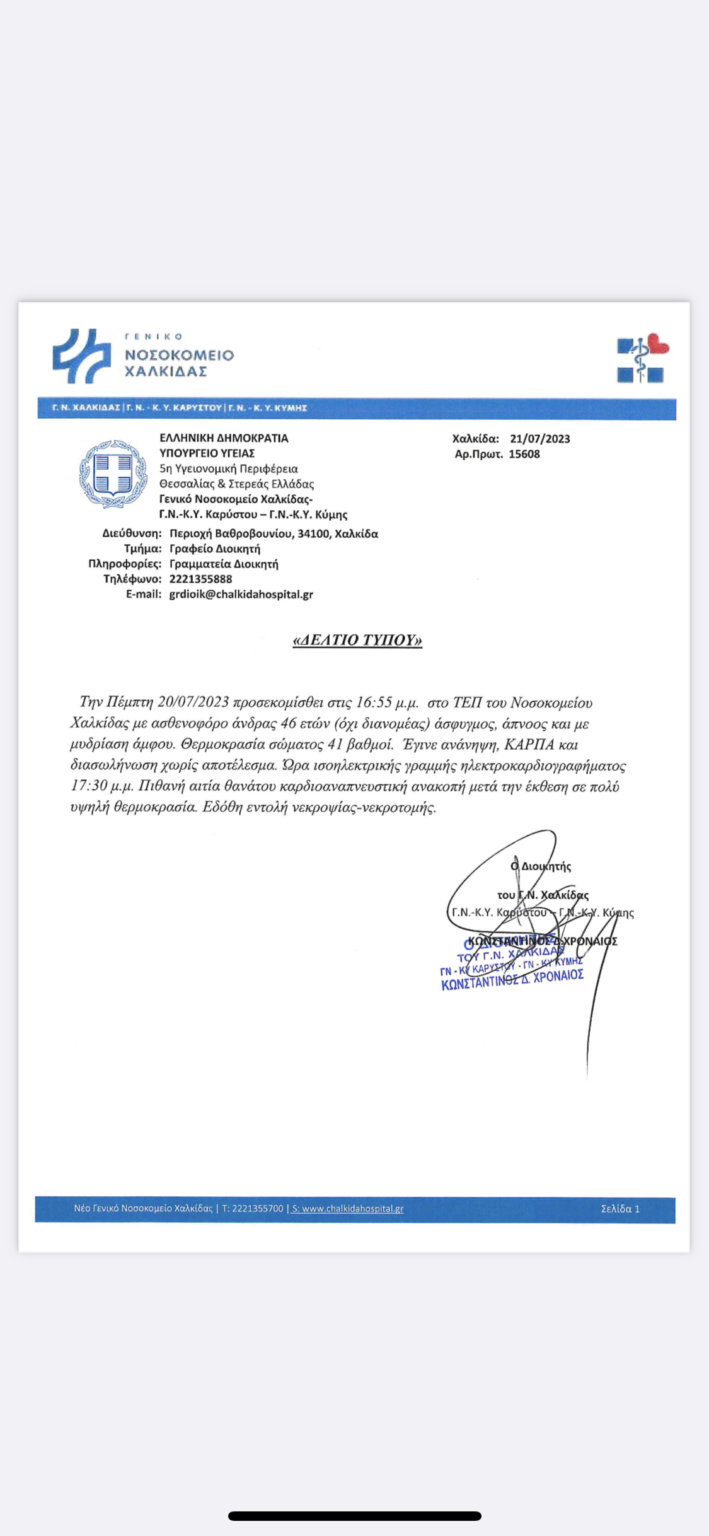 Το νοσοκομείο Χαλκίδας διαψεύδει το περιστατικό «δεν ήταν διανομέας» αναφέρει χαρακτηριστικά: