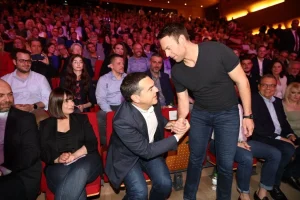 Αμέσως μετά την ομιλία του, ο Στέφανος Κασσελάκης χαιρέτησε τον Αλέξη Τσίπρα: