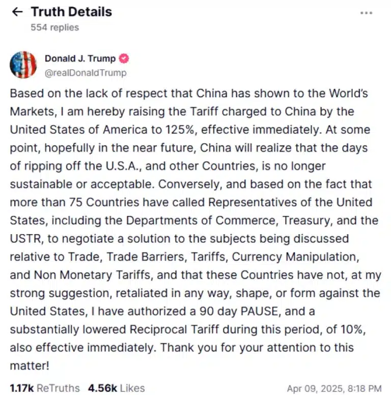 Ο Τραμπ εκτοξεύει τους δασμούς της Κίνας στο 125% και τους μειώνει στο 10% για τον υπόλοιπο κόσμο