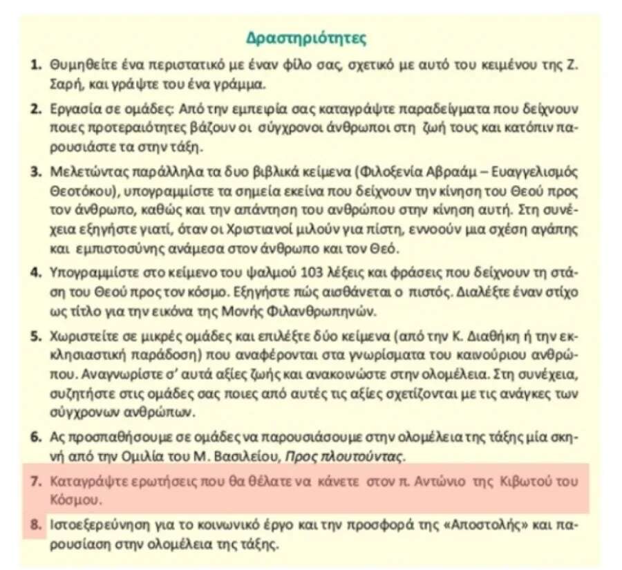 Στο βιβλίο «Ορθόδοξη πίστη και λατρεία», της Α’ Λυκείου, στη σελίδα 152 αφαιρείται η εικόνα και η λεζάντα που τη συνοδεύει: «4. «Κιβωτός του Κόσμου» π. Αντώνιος Παπανικολάου».
