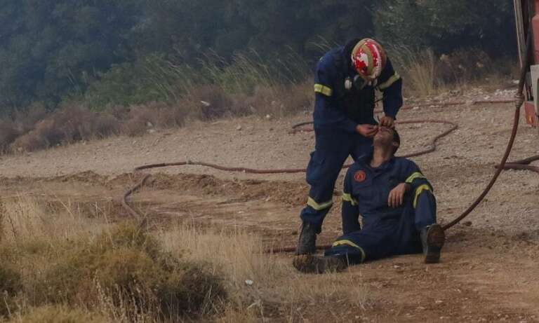 Οι πυκνοί καπνοί πλήττουν τα μάτια τους, η αναπνοή τους γίνεται μια πρόκληση, ωστόσο, η αποφασιστικότητα δεν υποχωρεί. Όπως φαίνεται στις συγκλονιστικές αυτές εικόνες, ένας πυροσβέστης έχει καθίσει στο έδαφος, ενώ ένας συνάδελφός του προσφέρει του οποία βοήθεια μπορεί.