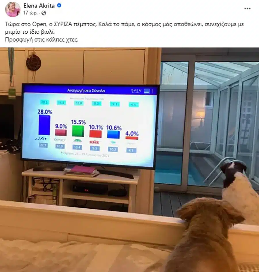 Η βουλευτής Επικρατείας του κόμματος της αξιωματικής αντιπολίτευσης ανέβασε φωτογραφία που δείχνει τα αποτελέσματα της δημοσκόπησης του OPEN, σύμφωνα με την οποία ο ΣΥΡΙΖΑ είναι πέμπτο κόμμα. Σε αυτή φαίνεται και η πισίνα του σπιτιού της, κάτι το οποίο η ίδια αντιλήφθηκε αργότερα, σχολιάζοντας: «Και για να τους προλάβω, ναι το σπίτι έχει πισίνα σχεδόν 40 χρόνια, από το 1985 που χτίστηκε. Αν είχα κάτι να κρύψω δεν θα τη φωτογράφιζα. Τον χορτασμένο μην φοβάσαι, το γιο της πλύστρας να φοβάσαι. Που μπήκε στην πολιτική με τρύπιο σώβρακο και βρέθηκε με κολοσσιαία περιουσία».