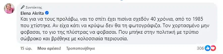 «Και για να τους προλάβω, ναι το σπίτι έχει πισίνα σχεδόν 40 χρόνια, από το 1985 που χτίστηκε. Αν είχα κάτι να κρύψω δεν θα τη φωτογράφιζα. Τον χορτασμένο μην φοβάσαι, το γιο της πλύστρας να φοβάσαι. Που μπήκε στην πολιτική με τρύπιο σώβρακο και βρέθηκε με κολοσσιαία περιουσία».