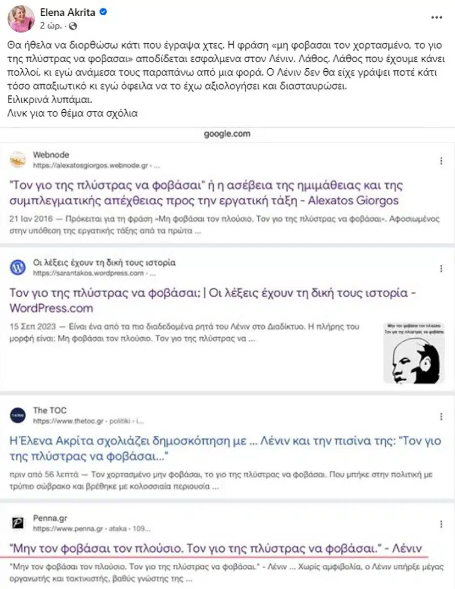 Μερικές ώρες μετά η Έλενα Ακρίτα έγραψε πως λυπάται διότι η φράση δεν ανήκει στον Βλαντίμιρ Λένιν όπως η ίδια πίστευε, τονίζοντας πως «δεν θα είχε γράψει ποτέ κάτι τόσο απαξιωτικό».