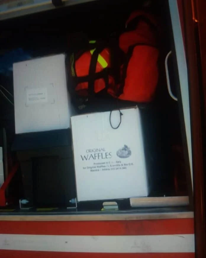 «Στη φωτογραφία βλέπουμε εξοπλισμό Πυροσβεστών και δύο… κούτες με βάφλες, εμπόρευμα που προορίζεται για το κατάστημα με κρέπες όπου διατηρεί ο διοικητής του Π.Κ. Θάσου…
