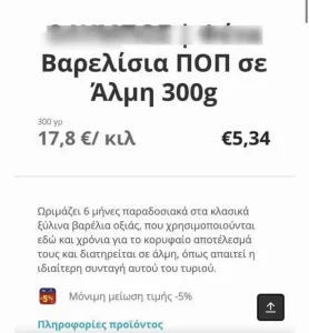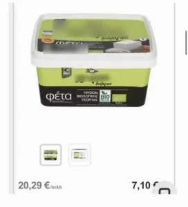 Μάλιστα ακόμα και σε περιπτώσεις που ο βασικός κωδικός (η φέτα) περιλαμβάνεται στο 5% (μόνιμη μείωση τιμής), η τιμή παραμένει σε υψηλά επίπεδα. Όπως αποδεικνύεται και από τη φωτογραφία, φέτα γνωστής εταιρίας παρά την μείωση στοιχίζει 17,80 ευρώ το κιλό.