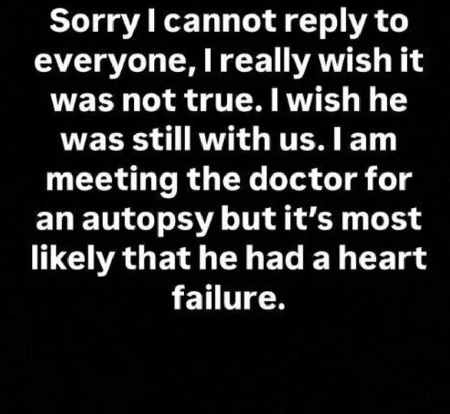 Μέχρι στιγμής, η οικογένειά του δεν έχει δώσει περισσότερες πληροφορίες για τις συνθήκες του θανάτου του, ενώ αναμένεται να διευκρινιστεί αν η ανακοπή καρδιάς ήταν αποτέλεσμα προϋπάρχοντος προβλήματος υγείας.