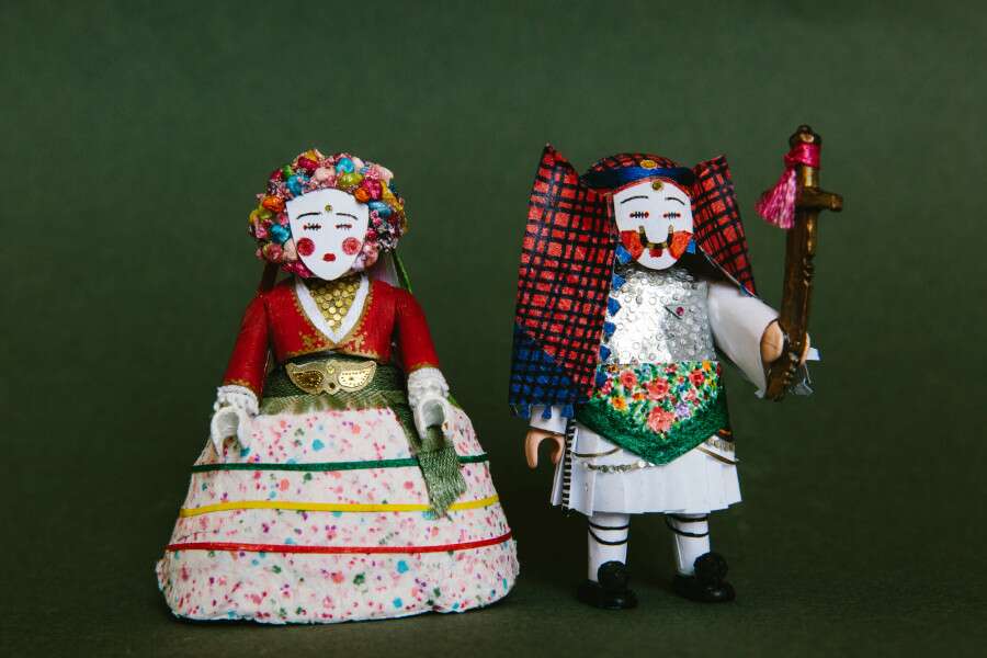 Σαρακατσάνες, Καραγκούνες, Βλάχες και άλλες χαρακτηριστικές φορεσιές από διάφορες περιοχές της Ελλάδας, κατασκευασμένες από κομμάτια χαρτιού, χαρτοπετσέτες, κουμπώματα σκουλαρικιών και ό,τι άλλο του φανεί χρήσιμο, μετατρέπονται σε πραγματικά έργα τέχνης στα χέρια του Πέτρου.