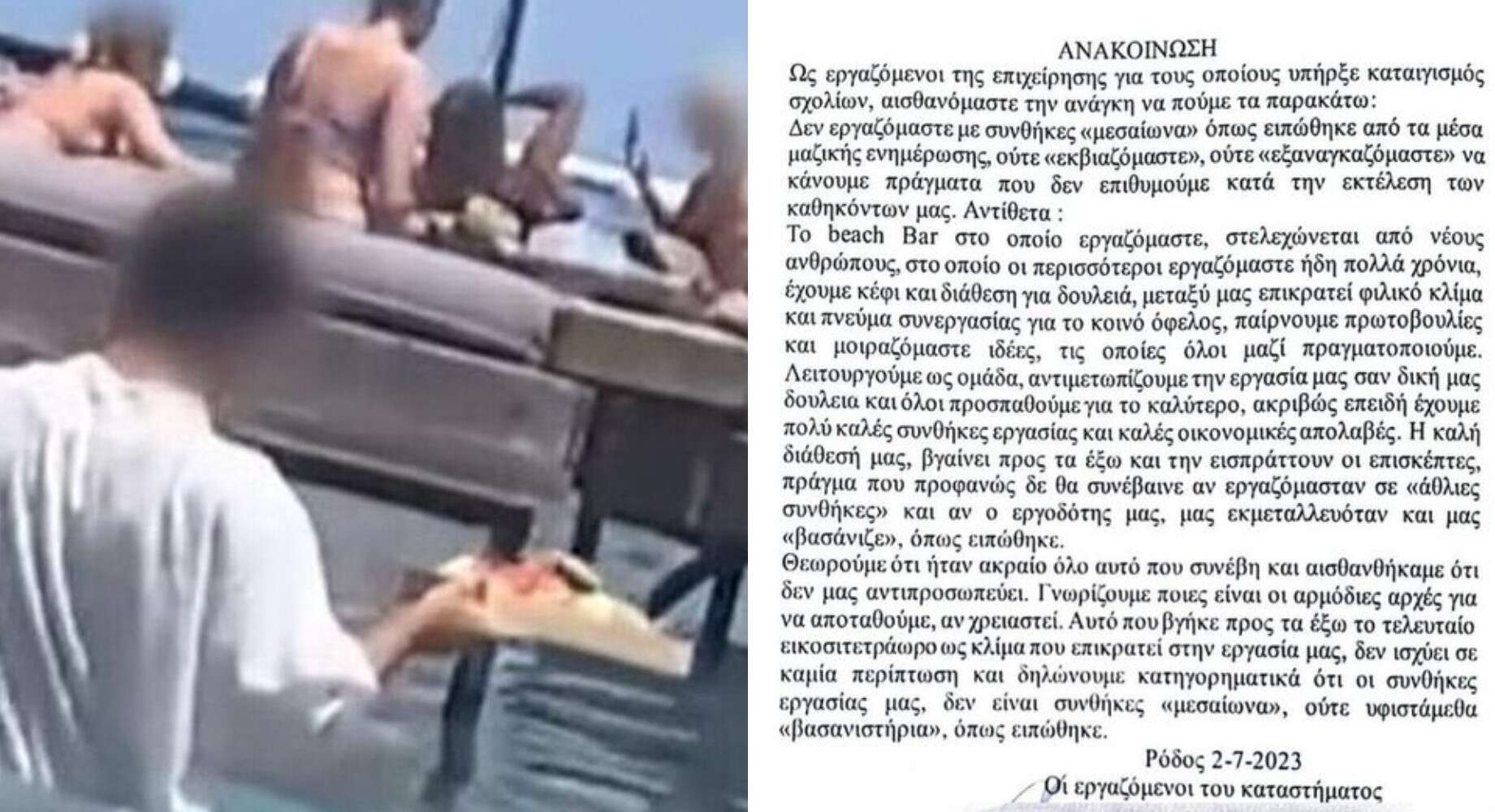 Μετά τα όσα έγιναν οι εργαζόμενοι του beach bar έβγαλαν ανακοίνωση, επισημαίνοντας πως «ούτε εκβιαζόμαστε ούτε εξαναγκαζόμαστε να κάνουμε πράγματα που δεν επιθυμούμε κατά την εκτέλεση των καθηκόντων μας».