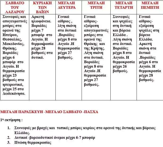 Ο Κλέαρχος Μαρουσάκης στην πρόγνωσή του ανέφερε πως δεν περιμένουμε αξιόλογα φαινόμενα τη Μ. Εβδομάδα παρά καποια αστάθεια μετά τη Μ. Πέμπτη.