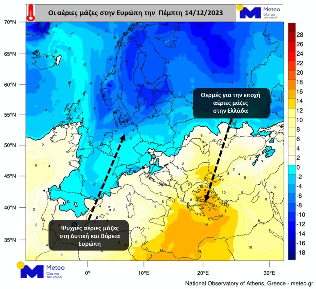 Ο έντονος ατμοσφαιρικός κυματισμός πάνω από την Ευρώπη θα έχει ως αποτέλεσμα οι υψηλές για την εποχή θερμοκρασίες που επικρατούν στη χώρα μας την Πέμπτη 14/12, να δώσουν τις επόμενες ημέρες τη θέση τους σε πολύ ψυχρές αέριες μάζες, με τη συνολική πτώσης της θερμοκρασίας να είναι της τάξης των 10-15 βαθμών κατά τόπους.