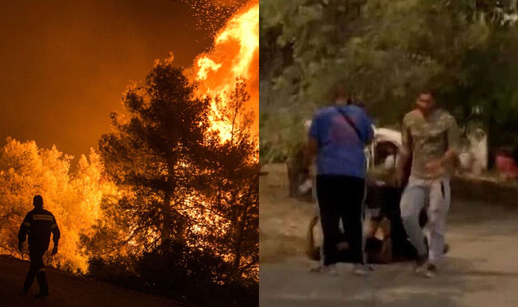 Νωρίτερα, αστυνομικοί και δημοσιογράφοι κινδύνευσαν από τις φλόγες στον οικισμό Αγία Παρασκευή, καθώς ο αέρας γύρισε και η φωτιά ήρθε με ταχύτητα προς το μέρος τους.