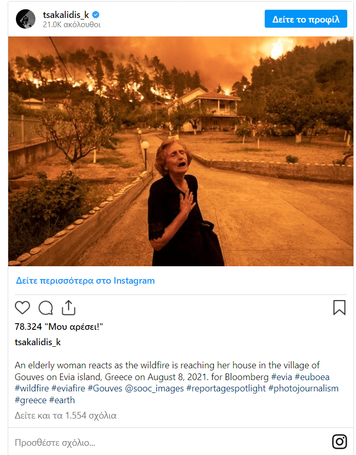 Η εικόνα τραβήχτηκε τον Αύγουστο του 2021, στις Γούβες στην καταστροφική φωτιά της Εύβοιας και αποτυπώνει τον πόνο που έζησαν οι κάτοικοι που είδαν τα σπίτια τους να καίγονται, μέσα σε ένα απόκοσμο σκηνικό. «Δεκάδες τεράστιες πυρκαγιές ξέσπασαν στην Ελλάδα το καλοκαίρι του 2021, σκοτώνοντας τρεις ανθρώπους, τραυματίζοντας τουλάχιστον 20 και καταστρέφοντας εκατοντάδες σπίτια εν μέσω ενός ιστορικού καύσωνα που κορυφώθηκε στις αρχές Αυγούστου, όταν στον Λαγκαδά, κοντά στη Θεσσαλονίκη, καταγράφηκαν 47,1 βαθμοί Κελσίου», αναφέρει ο Guardian.