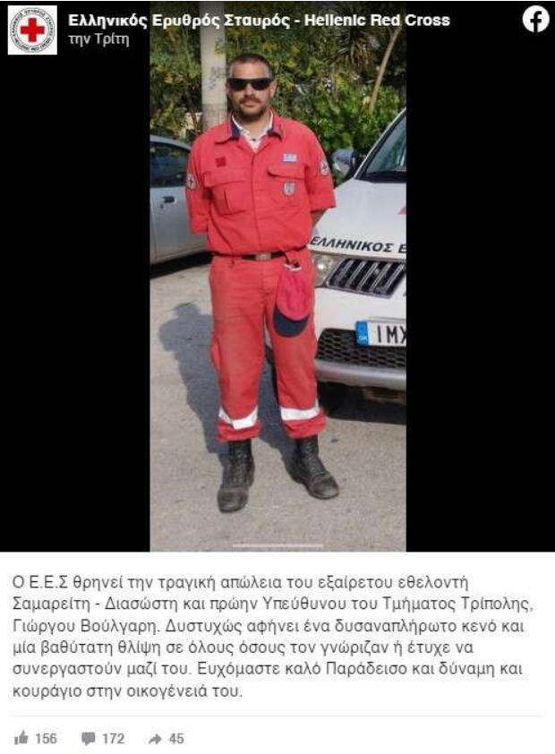 Ο Γιώργος Βούλγαρης ήταν ένας νέος άνθρωπος που είχε προσφέρει πολλά και μπορούσε να προσφέρει και άλλα στο μέλλον. Δυστυχώς, η μοίρα είχε άλλα σχέδια, καθώς έφυγε από την ζωή στα 35 του χρόνια. Ο θάνατος του αγαπητού εθελοντή διασώστη έχει βυθίσει σε θλίψη την Τρίπολη και τον Ερυθρό Σταυρό.