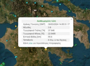 Σεισμική δόνηση μεγέθους 3,8 Ρίχτερ σημειώθηκε το μεσημέρι (30/03) 8,4 χιλιόμετρα βορειοδυτικά του Άργους