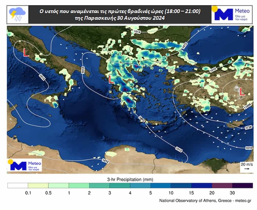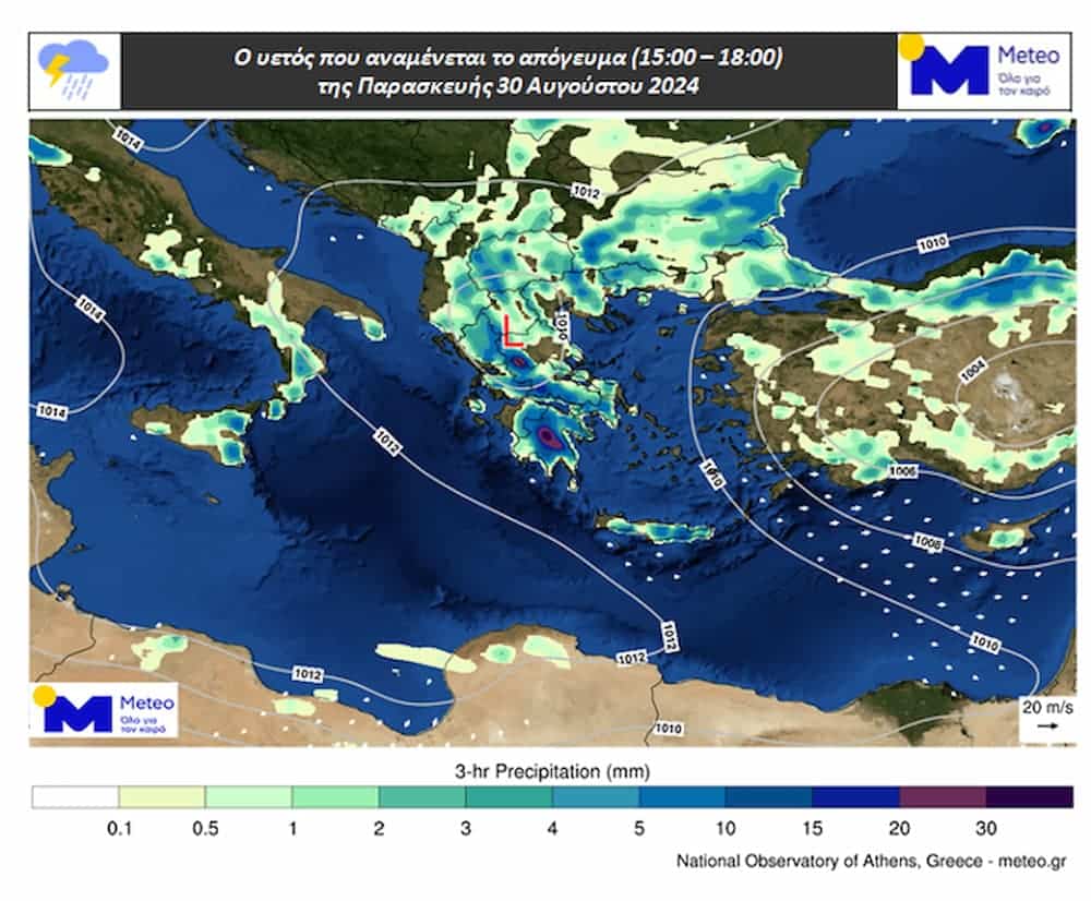 Χάρτης 1. Η βροχή που αναμένεται το απόγευμα (15:00 – 18:00) της Παρασκευής 30/08