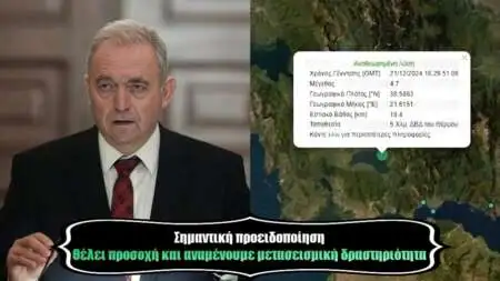 Ισχυρός σεισμός 4,7 βαθμών της κλίμακας Ρίχτερ σημειώθηκε το απόγευμα του Σαββάτου (21/12) στην Αιτωλοακαρνανία.