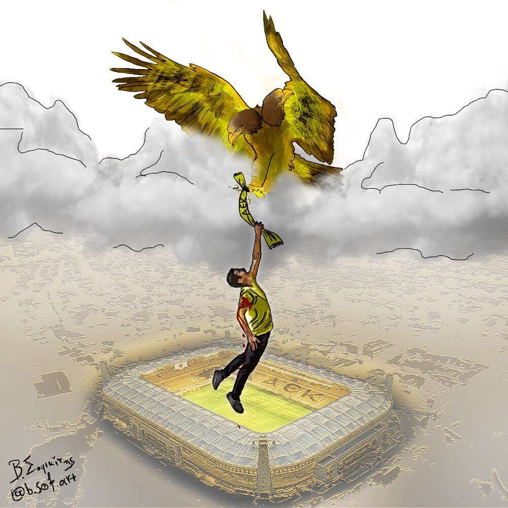 Περιγράφοντας το σκίτσο με τον δικέφαλο αετό που φεύγει στον ουρανό μαζί με τον τραυματισμένο Μιχάλη, σημειώσε πως «αυτό το παιδί έφυγε έξω από το γήπεδο της ομάδας του, της ΑΕΚ, μαζί με την αγάπη του για αυτή».