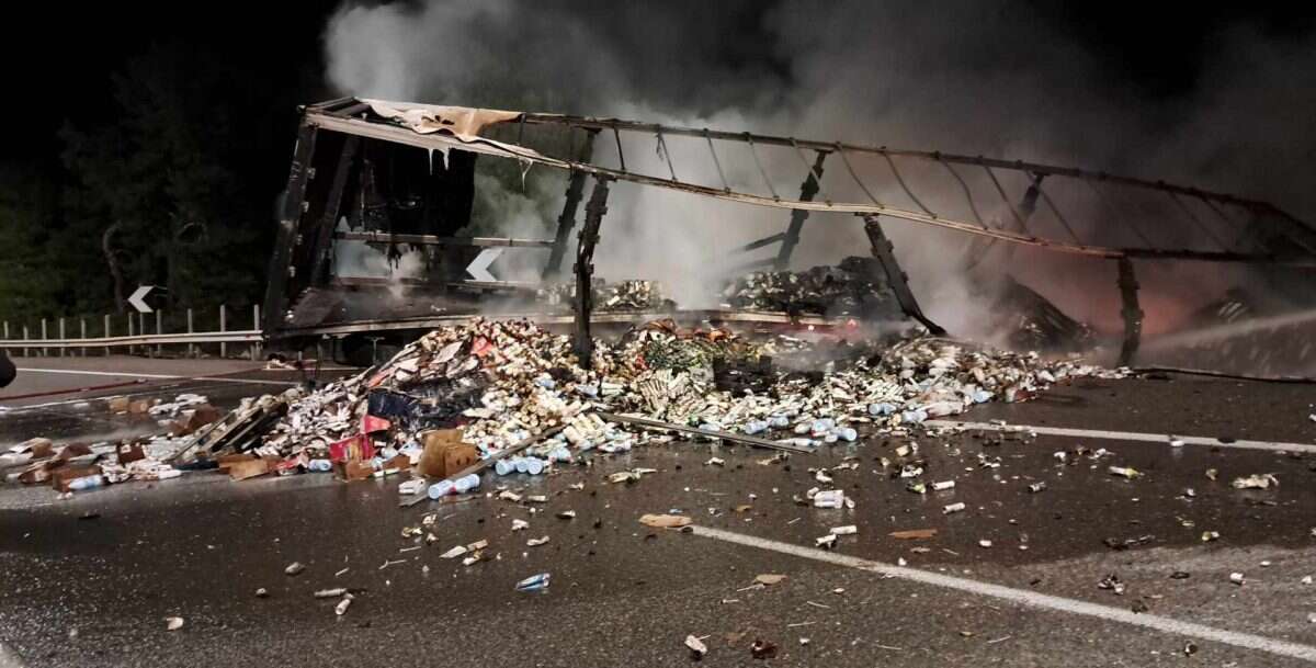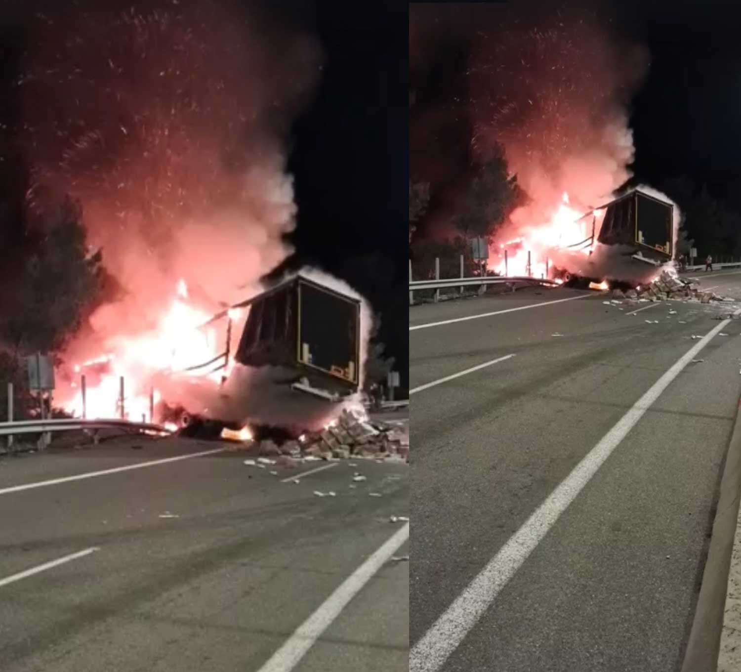 Όπως φαίνεται και στις εικόνες που τράβηξε με το κινητό του τηλέφωνο διερχόμενος οδηγός, η νταλίκα τυλίχθηκε στις φλόγες και κάηκε ολοσχερώς.