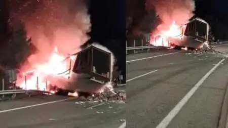 Η νταλίκα βγήκε εκτός δρόμου έσπασε το προστατευτικά κάγκελα και τυλίχθηκε στις φλόγες