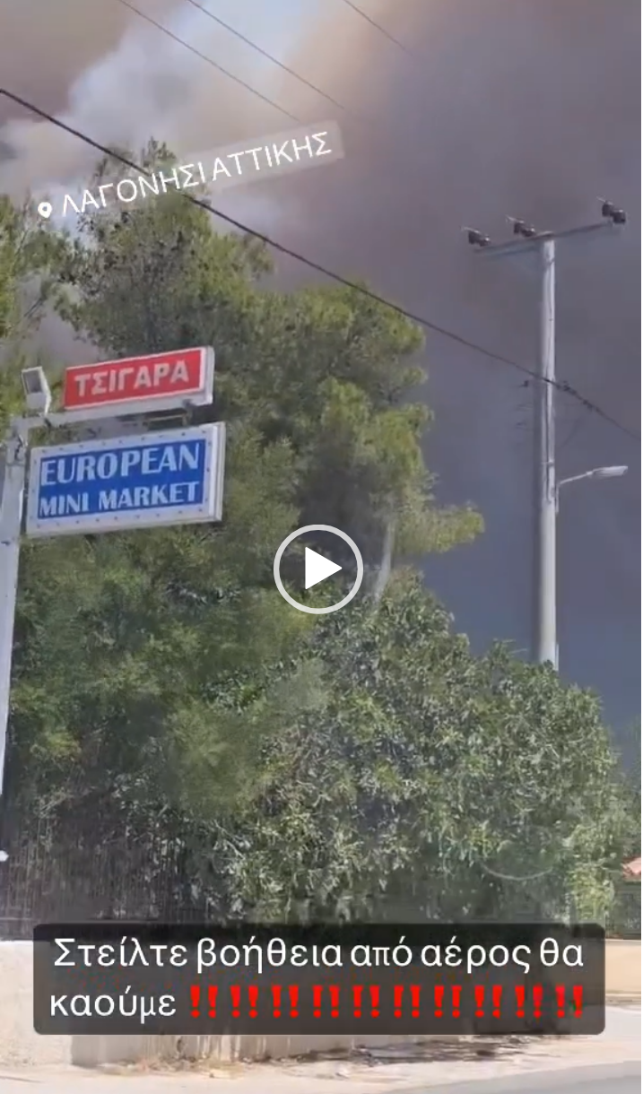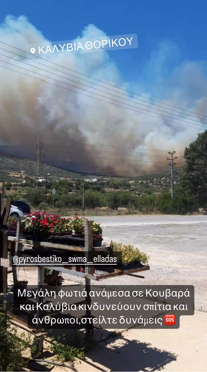 «Μεγάλη φωτιά ανάμεσα σε Κουβαρά και Καλύβια, κινδυνεύουν σπίτια και άνθρωποι, στείλτε δυνάμεις» έγραψε αρχικά ο Γρηγόρης Γκουντάρας, ενώ στη δεύτερη έκανε έκκληση να σταλεί βοήθεια από αέρος. «Στείλτε βοήθεια από αέρος θα καούμε» έγραψε κοινοποιώντας ένα βίντεο που του έστειλαν από το Λαγονήσι.