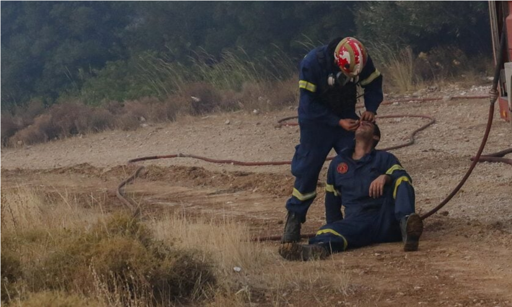Οι εικόνες από τους τόπους των πυρκαγιών είναι συγκλονιστικές. Ένας πυροσβέστης έχει κάτσει στο χώμα γύρω από τις φωτιές και ένας συνάδελφός του τον φροντίζει.
