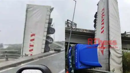 Όπως αναφέρουν πληροφορίες το τροχαίο σημειώθηκε όταν νταλίκα που κινούνταν επί της εξωτερικής Περιφεριακής Οδού στο ΄θυψος του Καλοχωρίου κάτω από αδιευκρίνιστες συνθήκες, προσέκρουσε στις προστατευτικές μεταλλικές μπάρες και έπεσε από την γέφυρα.
