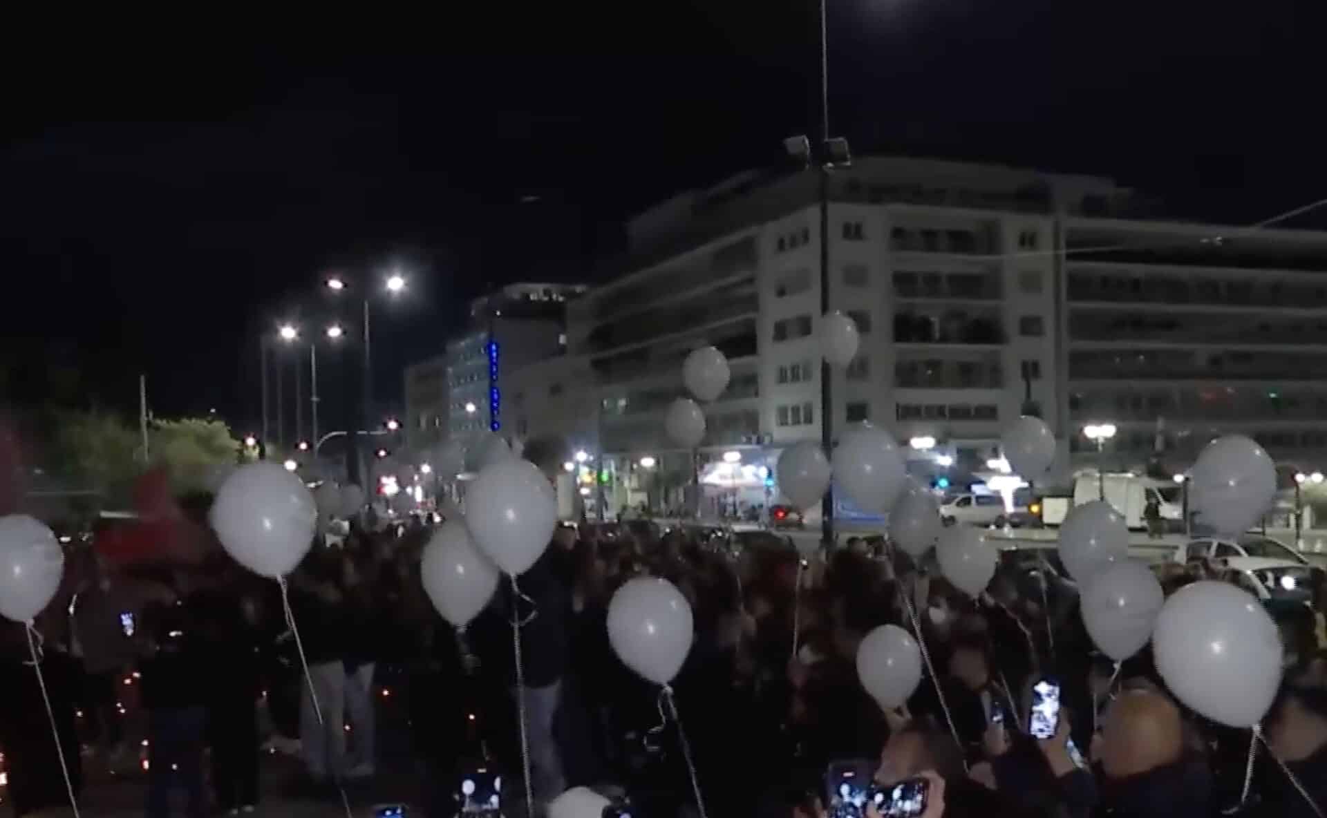 Στις 23:18 το βράδυ της Παρασκευής, μετά τα μεγαλειώδη συλλαλητήρια για τη συμπλήρωση δύο χρόνων από την μαύρη επέτειο των Τεμπών, πλήθος συγκεντρωμένο έξω από τη Βουλή στο Σύνταγμα, αφήνει 57 μπαλόνια με τις ηλικίες και τα ονόματα των νεκρών να φύγουν στον αττικό ουρανό.
