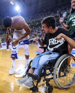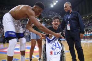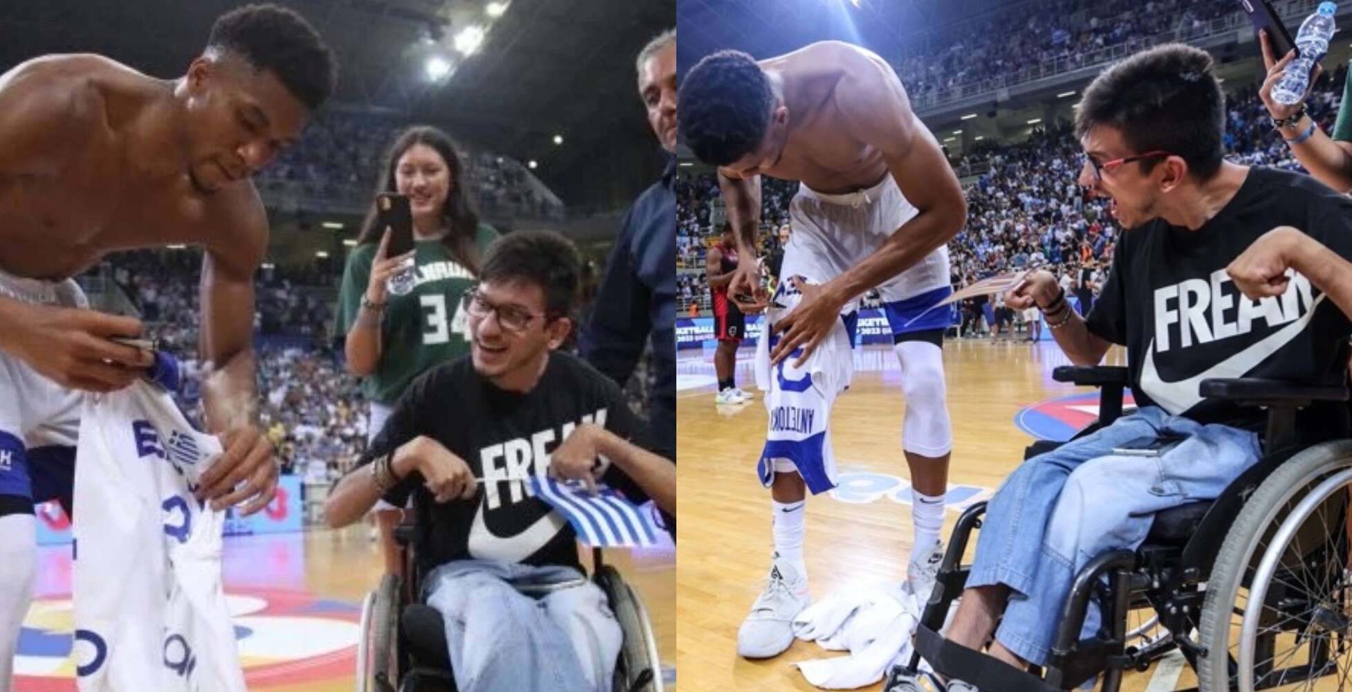 Ο αγαπημένος μας σούπερ σταρ του ΝΒΑ υπέγραψε τη φανέλα του και την παρέδωσε σε έναν μικρό φίλο της Εθνικής ομάδας, ο οποίος αντιμετωπίζει κινητικά προβλήματα. Φυσικά, δεν έλειψε η φωτογραφία μεταξύ τους, αποτυπώνοντας αυτήν την συγκινητική στιγμή.