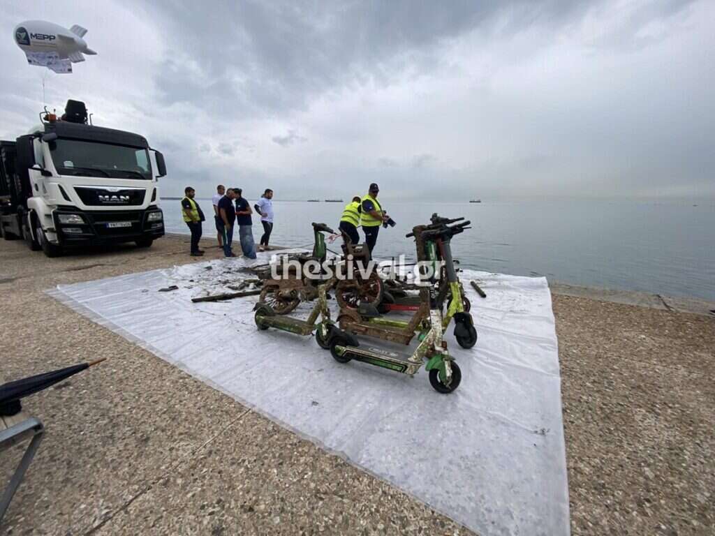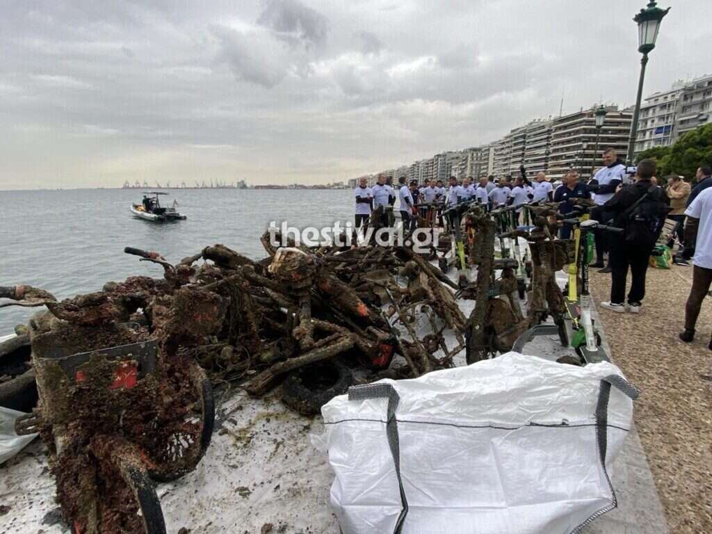 Ηλεκτρικά πατίνια, ποδήλατα, ελαστικά οχημάτων, κούπες, πλαστικά μπουκάλια, σκαμπό, ακόμη και βάση ομπρέλας, «ψάρεψαν» το πρωί της Τρίτης δύτες που βούτηξαν στον Θερμαϊκό Κόλπο, στο ύψους του Λευκού Πύργου, στη Θεσσαλονίκη.