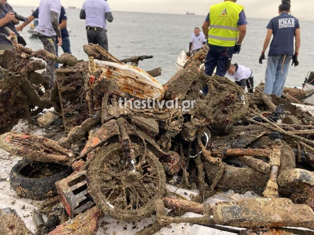 Μάλιστα προς το τέλος του καθαρισμού, εντοπίστηκε και ανασύρθηκε από τον βυθό του Θερμαϊκού και ένα μηχανάκι!