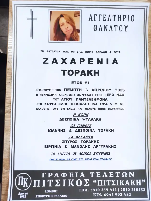 Η απώλεια της Ζαχαρένιας Τοράκη έχει βυθίσει σε βαθύ πένθος τους συγγενείς της και ιδιαίτερα την κόρη της, που ετοιμάζεται να δώσει φέτος πανελλαδικές. Ο θείος της, γνωστός δημοσιογράφος Μανόλης Αργυράκης, θρηνεί μαζί με την υπόλοιπη οικογένεια τον αδόκητο χαμό της.
