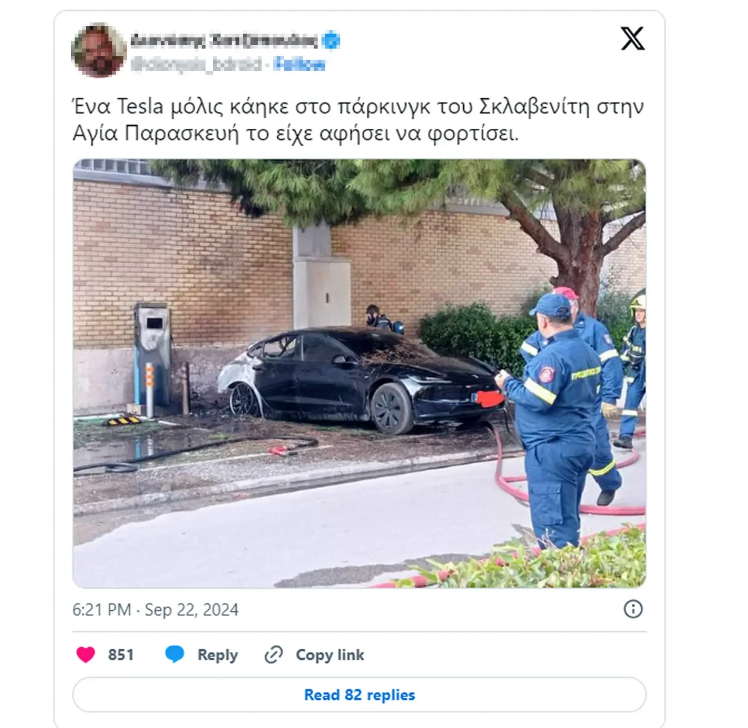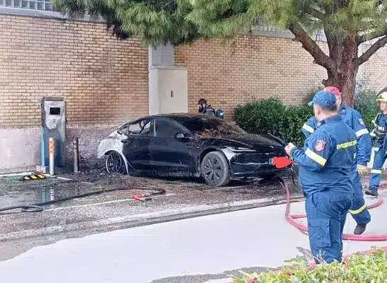Ένα Tesla Model 3 έπιασε φωτιά ενώ φόρτιζε σε χώρο στάθμευσης ενός σούπερ μάρκετ στην Αγία Παρασκευή, κοντά στην Αθήνα.