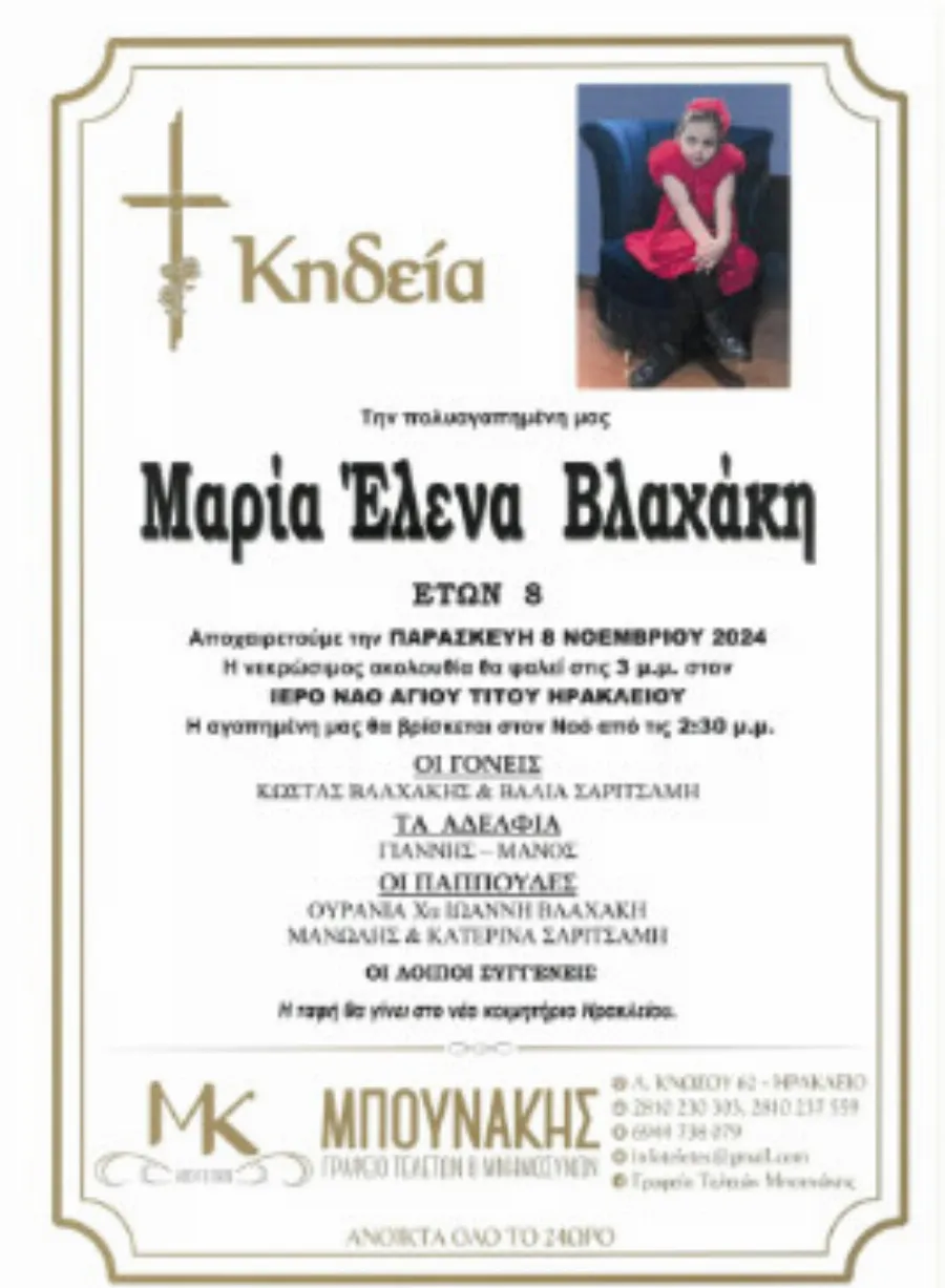 Σε κλίμα οδύνης συγγενείς και φίλοι θα πουν το τελευταίο αντίο στο 8χρονο αγγελούδι αύριο Παρασκευή στις 15.00 το μεσημέρι στον Ιερό Ναό του Αγίου Τίτου στο Ηράκλειο.