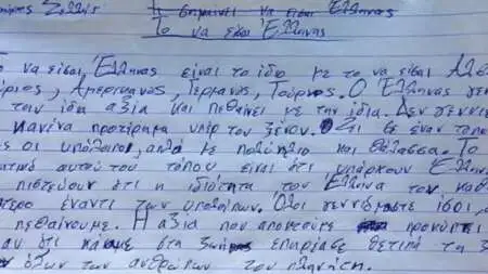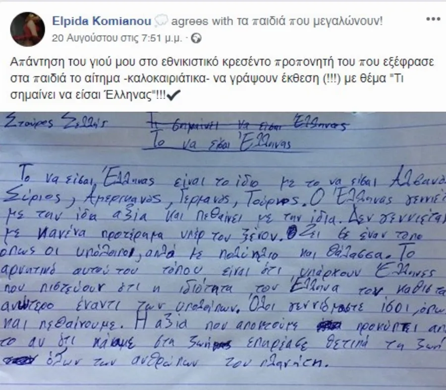 Πού να το φανταζόταν η ηθοποιός, δασκάλα θεατρικής αγωγής και μαμά κ. Ελπίδα Κομιανού, ότι ένα post στον λογαριασμό της στο Facebook, με μια έκθεση που έγραψε ο γιος της, απαντώντας στο ερώτημα «Τι σημαίνει να είσαι Έλληνας», θα «έριχνε» το ελληνικό internet.Όπως περιγράφει η μαμά πάνω από την φωτογραφία της έκθεσης: