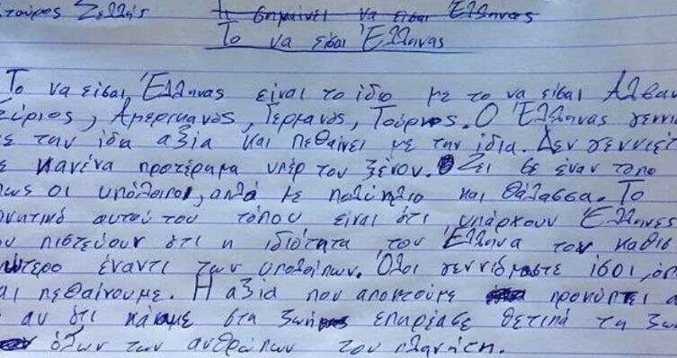 Απάντηση του γιού μου στο εθνικιστικό κρεσέντο προπονητή του που εξέφρασε στα παιδιά το αίτημα -καλοκαιριάτικα- να γράψουν έκθεση (!!!) με θέμα “Τι σημαίνει να είσαι Έλληνας”!!!