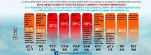 Από εκεί και πέρα ξεκινά και πάλι ο… βαρύς καύσωνας, αφού από την Τετάρτη που ανεβαίνει η θερμοκρασία στους 38 βαθμούς Κελσίου, Πέμπτη, Παρασκευή και Σάββατο το θερμόμετρο θα αγγίξει έως και τους 39 βαθμούς. Από την Κυριακή (6/8) έως και την Τετάρτη (9/8), η θερμοκρασία θα πέσει πάλι και θα κινείται μεταξύ 35 και 36 βαθμών Κελσίου.