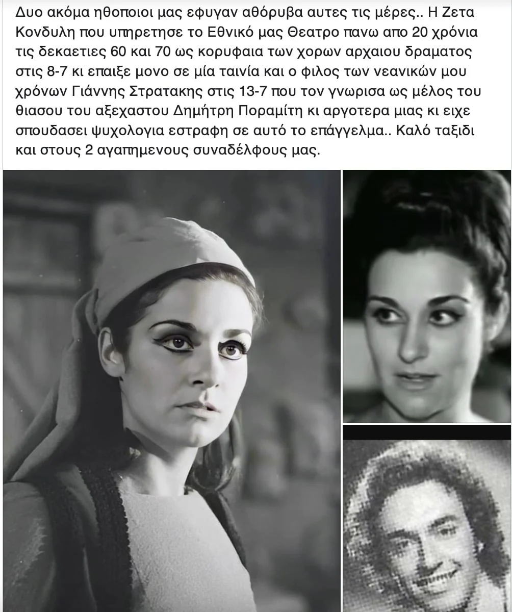 “Δυο ακόμα ηθοποιοί μας έφυγαν αθόρυβα αυτές τις μέρες.. Η Ζέτα Κονδύλη που υπηρετησε το Εθνικό μας Θέατρο πάνω απο 20 χρόνια τις δεκαετιες 60 και 70 ως κορυφαία των χορών αρχαίου δράματος κι έπαιξε μονο σε μία ταινία.