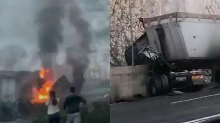 Από τη σφοδρή πρόσκρουση ο οδηγός του, ένας άνδρας 60 περίπου ετών, εγκλωβίστηκε στην καμπίνα του οχήματος, το οποίο γρήγορα τυλίχθηκε στις φλόγες.