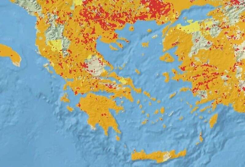 Ο χάρτης του Ευρωπαϊκού Παρατηρητήριου Ξηρασίας. Με κόκκινο οι περιοχές σε επίπεδο συναγερμού και με πορτοκαλί οι περιοχές με προειδοποίηση:
