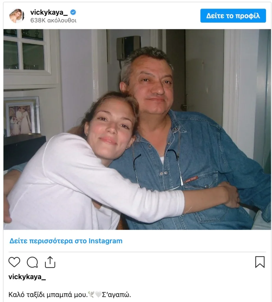 Πιο συγκεκριμένα, το μεσημέρι της Τετάρτης 24 Απριλίου, η Βίκυ Καγιά ανήρτησε μία κοινή φωτογραφία με τον πατέρα της από το παρελθόν και έγραψε: «Καλό ταξίδι μπαμπά μου. Σ΄αγαπώ».