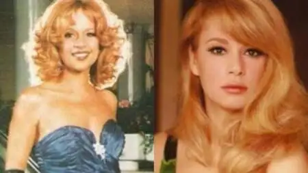 Τα χαρακτηριστικά ξανθά μαλλιά της είναι χτενισμένα σε μπούκλες, ενώ το μακιγιάζ της είναι bronze με μία γυαλιστερή όψη στα χείλη.