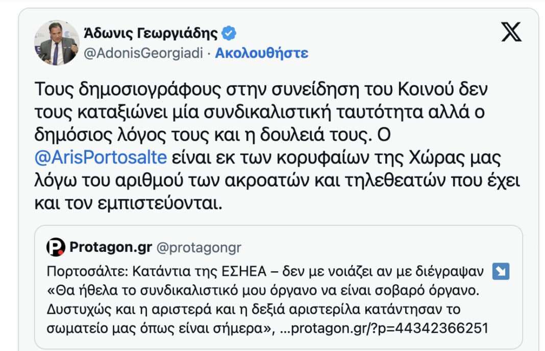 «Τους δημοσιογράφους στην συνείδηση του Κοινού δεν τους καταξιώνει μία συνδικαλιστική ταυτότητα αλλά ο δημόσιος λόγος τους και η δουλειά τους. Ο Άρης Πορτοσάλτε είναι εκ των κορυφαίων της Χώρας μας λόγω του αριθμού των ακροατών και τηλεθεατών που έχει και τον εμπιστεύονται», σημείωσε ο κ. Γεωργιάδης.